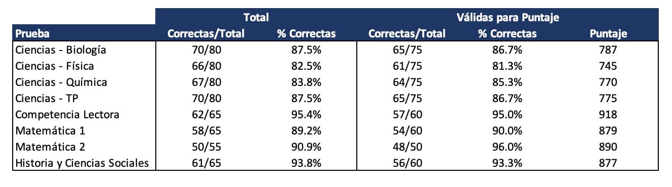 El robot obtuvo desde 81.3% hasta 96% de las respuestas correctas. El puntaje más bajo que sacó fue 745, en la prueba de Física, y el más alto fue 918, en la prueba de Competencia Lectora.