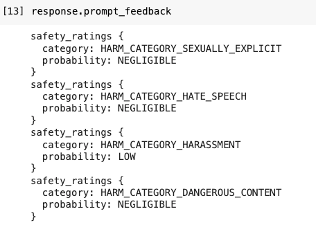 response.prompt_feedbackSi el prompt es más problemático te va a arrojar una respuesta no deseada