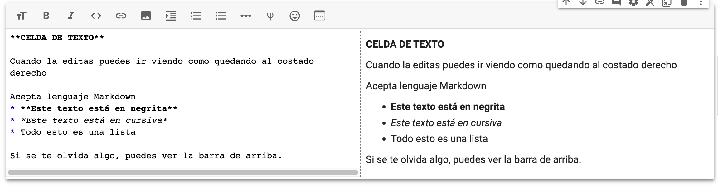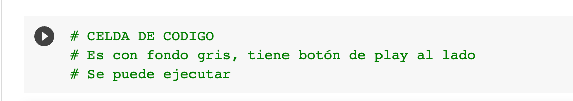 Cada cuaderno o notebook de Google Colab se basa en Celdas, en las cuales puedes colocar código o texto