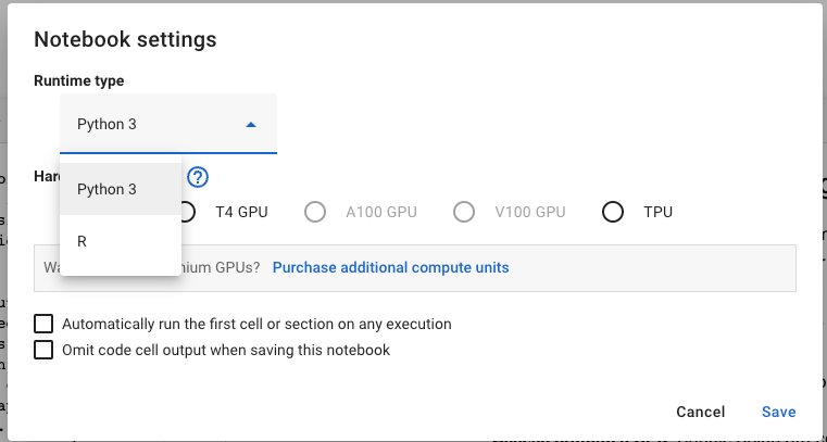 A pesar de que es generalmente usado con Python, es posible usarlo con R. Para eso debes ir a Edit > Notebook settings