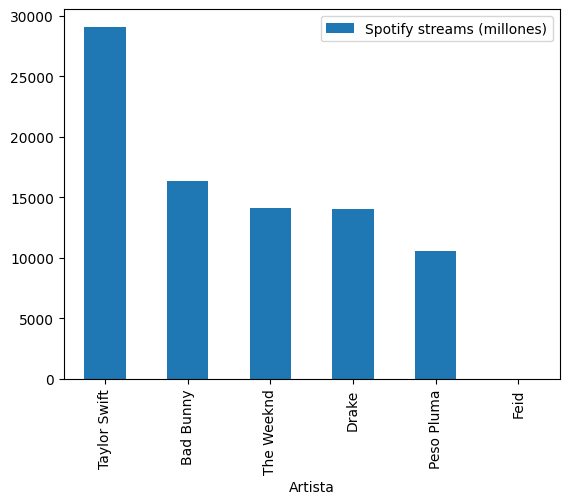df_artistas = pd.read_excel("https://docs.google.com/uc?export=download&id=1bqVTtpAF50QSlrtB6DjfeHx1w9UKT7O3")Gráfico de barra