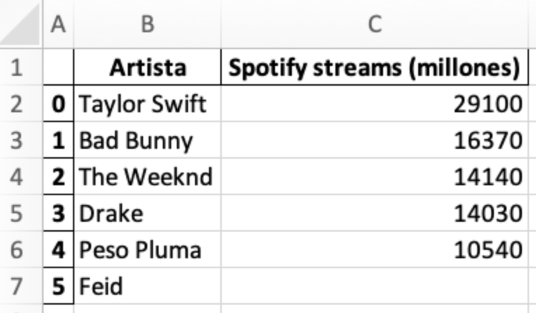 df_artistas.to_excel("artistas.xlsx")Luego en Excel, la información luce así